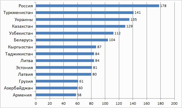 Самой благополучной страной на постсоветском пространстве является Армения, где показатель молодежной смертности составляет 58 случаев на 100 тыс. человек. Не отстают от лидера Азербайджан (60 на 100 тыс. чел.) и Грузия (61 на 100 тыс. чел.) Примечательно, что тройку лидеров на постсоветском пространстве также не обошли боевые действия, однако предпринимаемые руководством республик меры сделали свое дело.