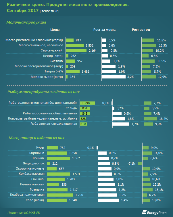 Среди продуктов животного происхождения наиболее заметно подорожали молочные товары: сырое и пастеризованное молоко ( на 3,2% и 1,9% за месяц, соответственно), творог (на 1,9%), сметана ( на 1,1%).