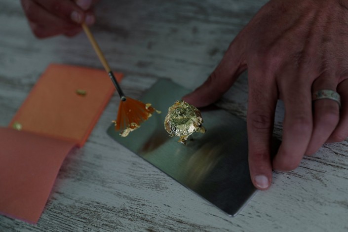 Португальский кондитер Даниэль Гомес готовит конфету, состоящую из чистого 23-каратного золота, во время международной шоколадной ярмарки в Обидуше. 16 марта 2018. Фото © REUTERS / Rafael Marchante