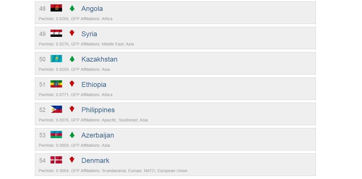Казахстан, заняв 50-ю строчку рейтинга, обошёл Бельгию, Боливию, ОАЭ, Хорватию и Ливию. При этом ВС РК уступили в рейтинге армиям Узбекистана, Швейцарии, Анголы, Сирии и Польши.