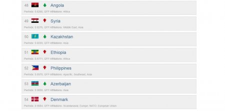 Опубликован окончательный рейтинг Global Firepower, в котором Казахстан занял 50-ю строчку, сообщает сайт Global Firepower. Рейтинг основан на 55 отдельных факторах, которые определяют балл PowerIndex ("PwrIndx") данной страны. Окончательный расчёт военной мощи страны определяется при помощи специальной системы бонусов и штрафов.