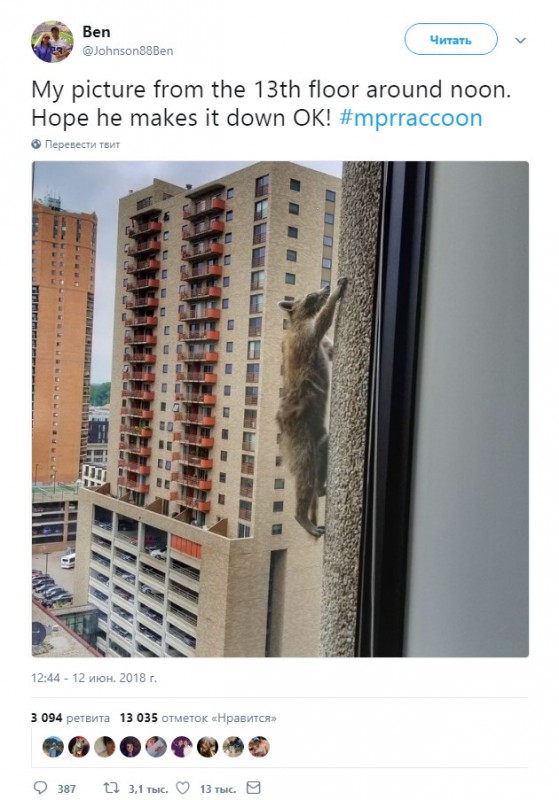 Енот забрался по стене небоскреба в городе Сент-Пол на несколько этажей "как человек паук, и в процессе приковал внимание и испугал множество людей, следивших за ним онлайн". Потом он залез еще выше и разместился на подоконнике с внешней стороны окон. К полудню животное достигло 23 этажа (около 60 метров) и вновь остановилось на подоконнике на "передых".