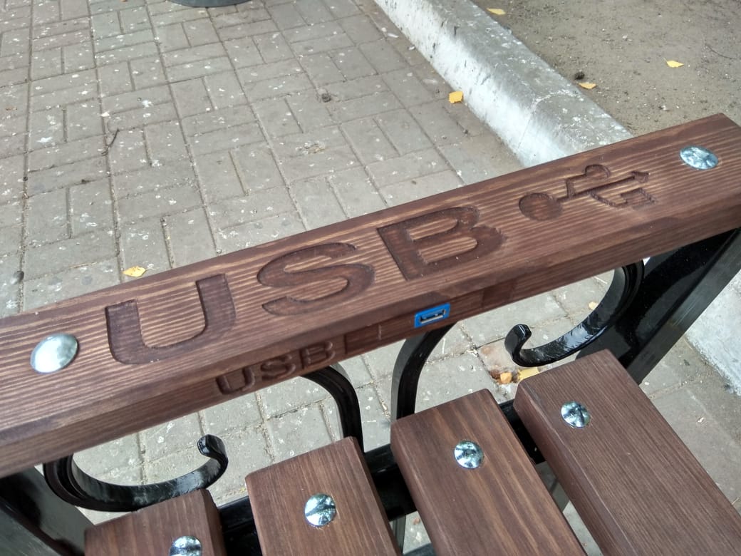 Правда, солнечная батарея расположена над лавочкой, а разъёмы для кабелей находятся на подлокотниках. По одному на каждом.