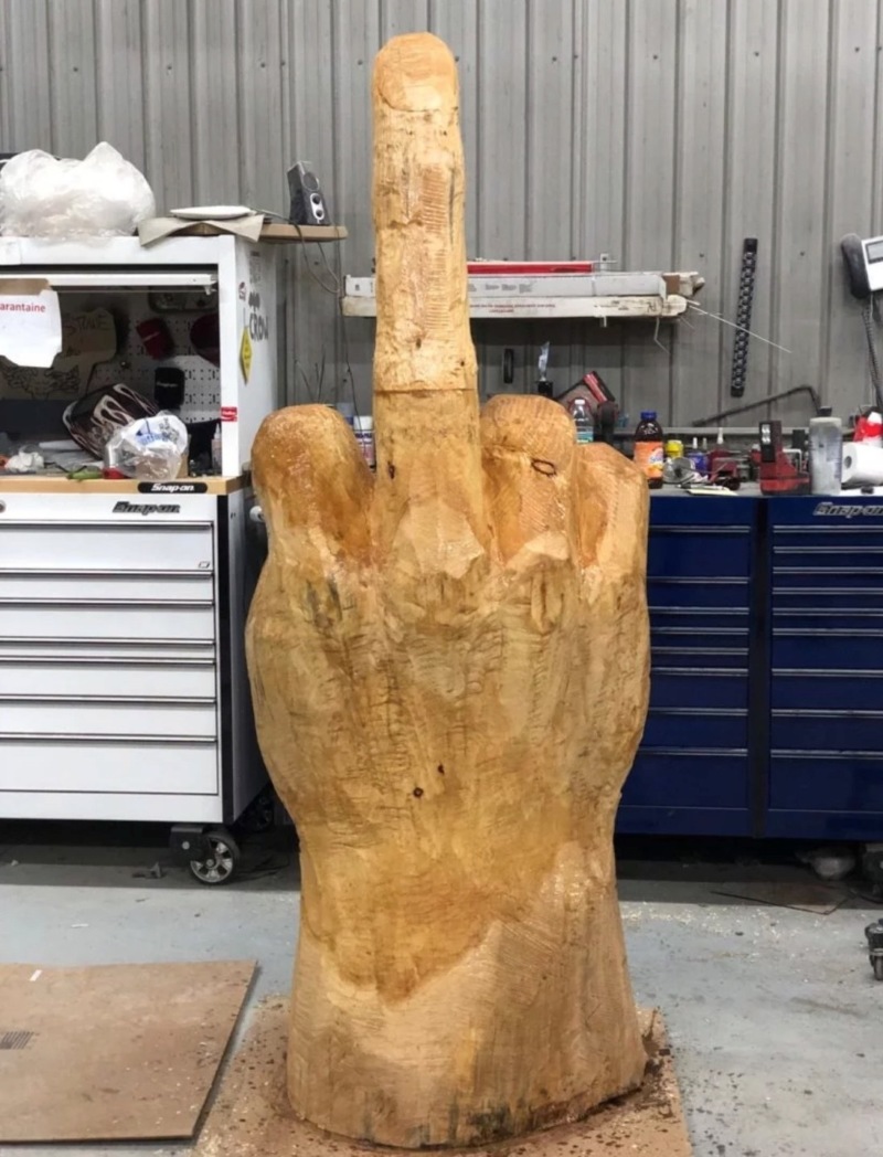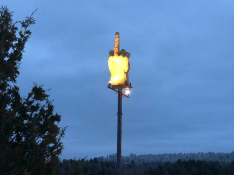 Житель города Уэстфорд (штат Вермонт) Тед Пелки (Ted Pelkey) установил возле трассы огромную деревянную скульптуру руки, показывающей средний палец. Пелки рассказал СМИ, что таким образом он обратился к местным властям, которые много лет не давали ему разрешение на строительство гаража.