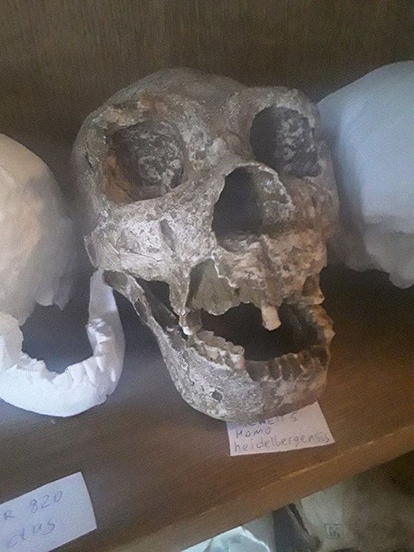 Череп гейдельбергского человека, который жил в Европе 700-345 тысяч лет назад , хранится на кафедре антропологии биологического факультетая МГУ им М.В. Ломоносова