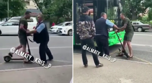 Алматинец попал под колеса джипа после драки с водителем автобуса, передает корреспондент Tengrinews.kz. Инцидент сняли на видео. Все происходит на автобусной остановке. Шофер автобуса пытался отобрать электросамокат у мужчины. Последний не выпускал свое транспортное средство из рук. При этом на лице водителя автобуса видна кровь. В конце ролика владельца самоката сбивает машина, он отлетает.