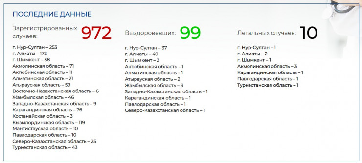 На сегодняшний день в стране подтверждено 972 случая коронавируса. Из них в Нур-Султане - 253 случая, Алматы - 172 случая, Карагандинской области - 76 случаев, Акмолинской области - 71 случай, Атырауской области - 59 случаев, Жамбылской области - 46 случаев, Шымкенте - 38 случаев, Восточно-Казахстанской области - 6 случаев, Алматинской области - 21 случай, Актюбинской области - 11 случаев, Северо-Казахстанской области - 25 случаев, Павлодарской области - 10 случаев, Мангистауской области - 10 случаев, Кызылординской области - 119 случаев, Западно-Казахстанской области - 9 случаев, Туркестанской области - 43 случая, Костанайской области - 3 случая.