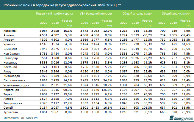 "В городах страны в мае текущего года цена на первичный прием у врача выросла на 16,1 процента за год – до 3,1 тысячи тенге. Среди крупных городов дороже всего первичный прием обходился алматинцам (4,5 тысячи тенге), дешевле всего – жителям Туркестана (1,9 тысячи тенге)", – сообщают аналитики.