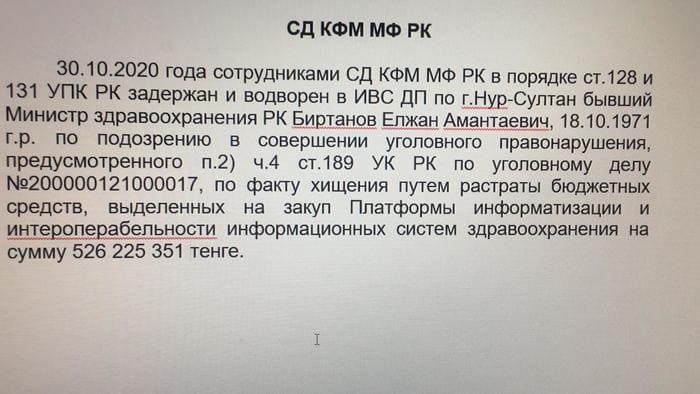Согласно этому неподтвержденному документу, бывшего министра якобы задержали «по подозрению в совершении уголовного правонарушения, предусмотренного пунктом 2 части 4 статьи 189 Уголовного кодекса РК (присвоение или растрата вверенного чужого имущества), по факту хищения путем растраты бюджетных средств, выделенных на закуп Платформы информатизации и интероперабельности информационных систем здравоохранения на сумму 526 225 351 тенге».