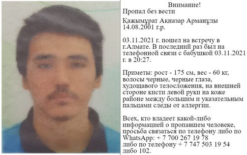 Его отец в соцсетях сегодня сообщил, что сын пошел на встречу в Алматы 3 ноября, после чего пропал.