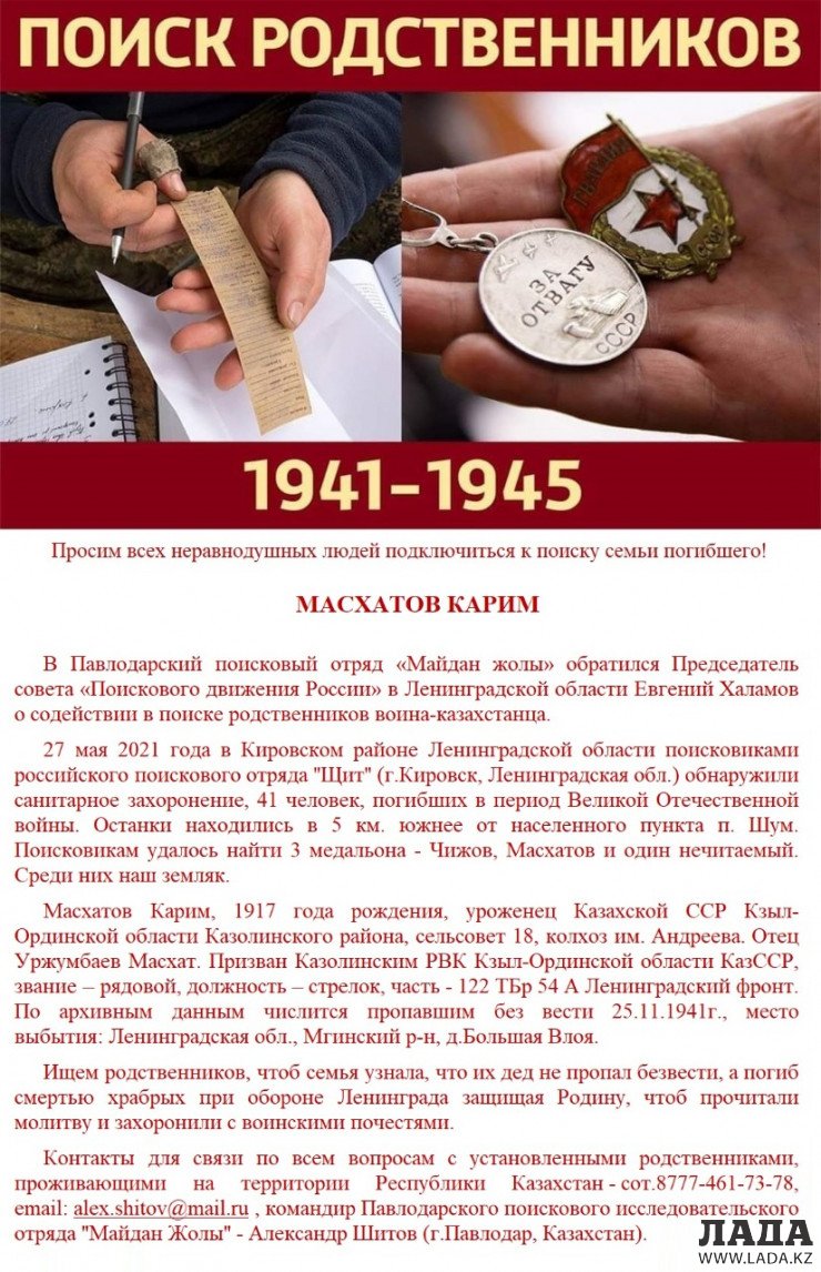 "В объявлении фамилия была написана Масхатов, а он Максатов. Несмотря на эту ошибку, мы поняли, что речь идет о двоюродном брате моего отца - Кариме. Конечно, все родственники обрадовались, с начала войны о нем не было никаких известий", - говорит Алдамбергенов.