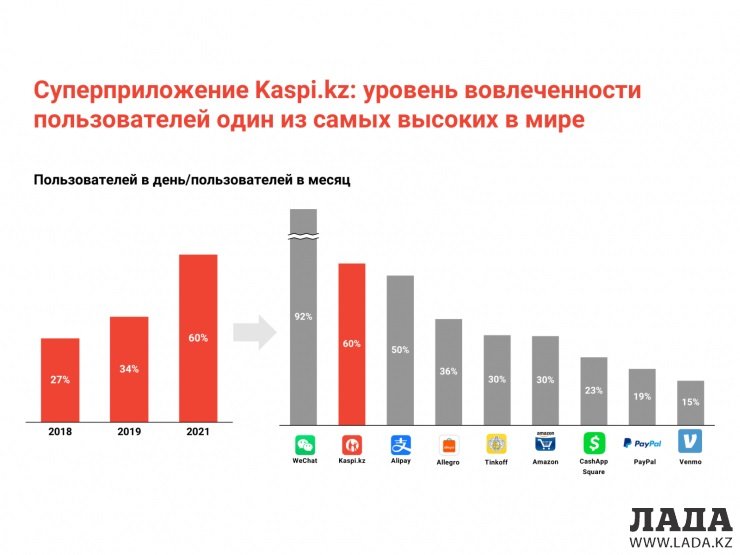 Суперприложением Kaspi.kz пользуются уже более 11 миллионов человек. Из них 6,5 миллиона заходят в приложение ежедневно. То есть из десяти человек шестеро используют мобильные сервисы Kaspi.kz ежедневно. Уровень вовлеченности составляет 60 процентов, и это один из самых высоких показателей в мире.