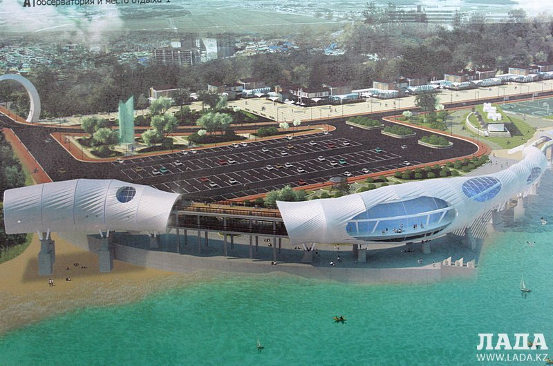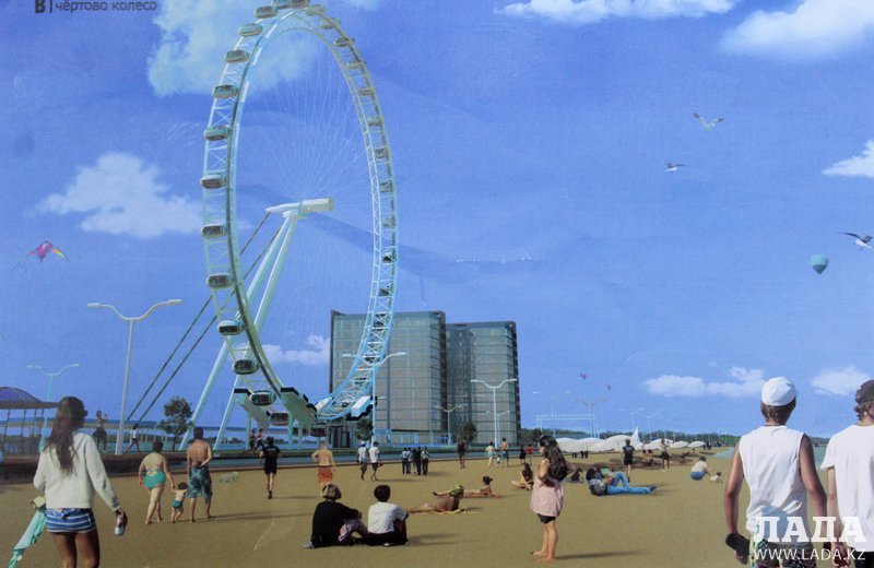 А это, уважаемый читатель, запланированное колесо обозрения. Современное и высокое. Сложно не согласиться с тем, что на побережье оно смотрелось бы куда эффектнее, чем в парке «Акбота». Представители городского акимата в 2012 году почему-то так не подумали. Теперь на этом месте, впрочем как и тогда, растет камыш и образуется болото.