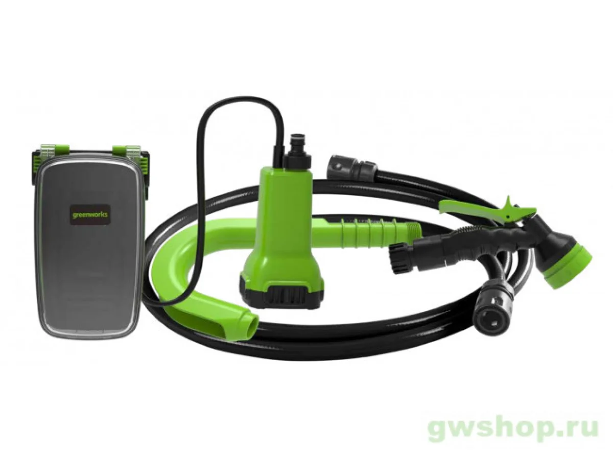 Насос питается от литий-ионного аккумулятора Greenworks 24 В, который подходит ко всей технике линейки 24 В. Батарейный отсек устройства имеет класс защиты IPX4 и надежно защищен от попадания влаги. Время автономной работы от батареи емкостью 4 А*ч составляет 50 мин. Этого более чем достаточно для полива участка средних размеров. В комплект поставки входит двухметровый шлаг и пистолет-распылитель с 8-ю различными режимами: от мелкодисперсного тумана до тонкой струи. Это дает возможность аккуратно и бережно поливать даже самые нежные растения и цветы.