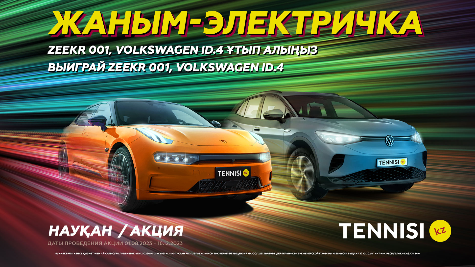 Суперфинал «Жаным-электрички» состоится 16 декабря в 19:00 по астанинскому времени. Победитель розыгрыша среди красных купонов получит Volkswagen ID.4, а среди желтых – Zeekr 001. Чем больше купонов у участника, тем больше шансов на главные призы! Обладателей электромобилей Tennisi.kz выберут в прямом эфире – путем составления номера купона из вытянутых шаров в случайном порядке.