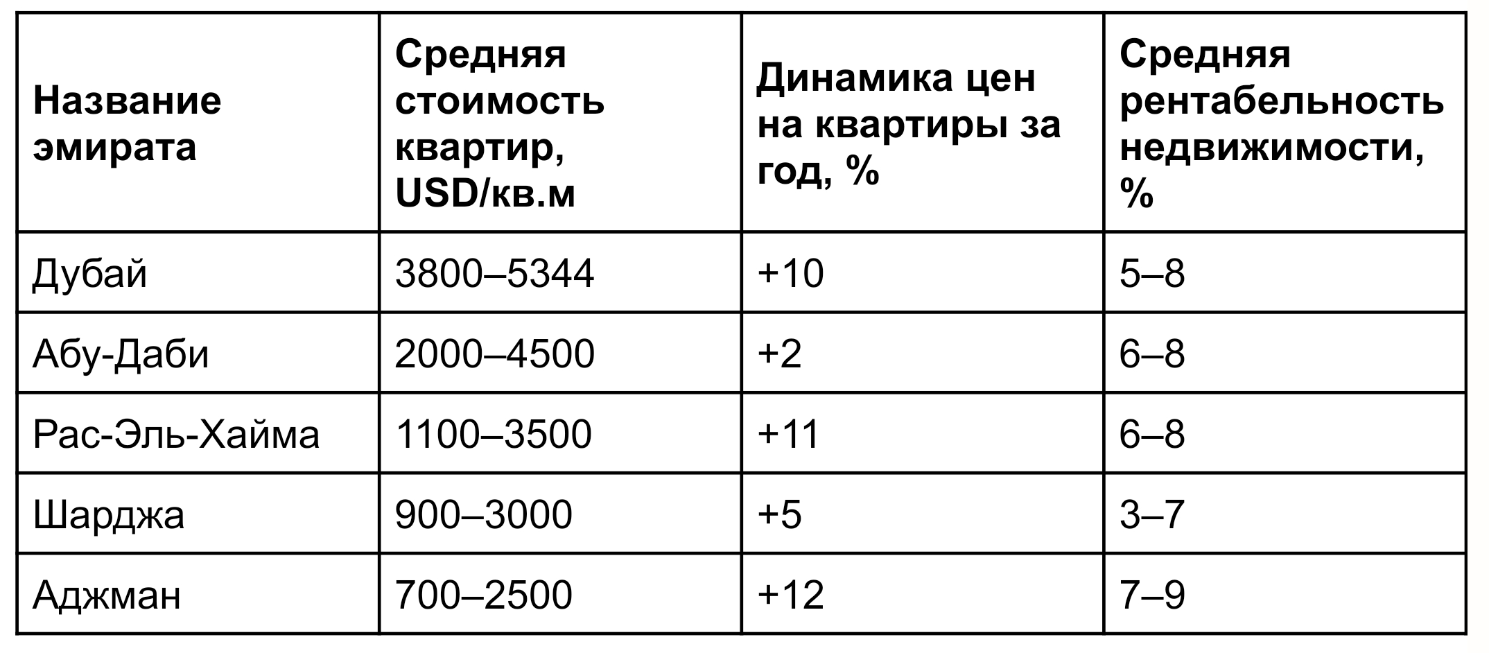 Ниже представлена диаграмма с ценовым диапазоном на квартиры по эмиратам, а также сводная таблица с краткой информацией о динамике стоимости на апартаменты за год, а также средней рентабельности недвижимости в Арабских Эмиратах.