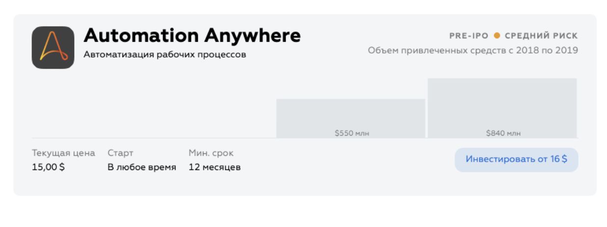 3. Сервис для автоматизации бизнес-процессов под названием Automation Anywhere. Компания развивает технологию решения рутинных задач с помощью ботов. Клиентами Automation Anywhere уже являются крупные компании (Dell, LinkedIn, Siemens и другие). В 2018 оборот Automation Anywhere увеличился более чем на 46%. В календаре IPO Automation Anywhere прогнозируется в 2021-2022 гг.