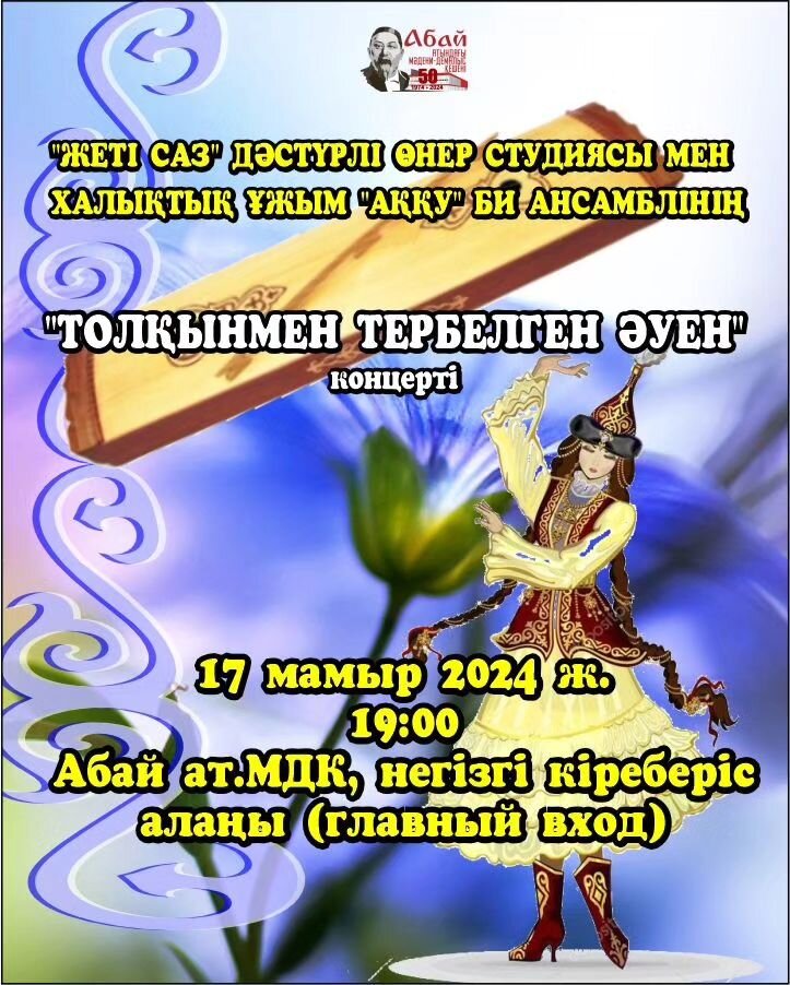 Уже 17 мая концерт дадут студия национального искусства «Жетісаз» и народный коллектив ансамбля танца «Аққу».