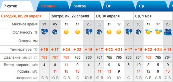 В «rp5» указано, что средняя температура на три дня продержится в пределах 23°C днем и 17°C ночью. 29 и 30 апреля будет ясно, в День единства народа Казахстана, 1 мая, ожидается небольшая и переменная облачность.