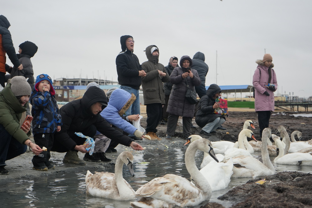 Местная семья Молдир и Наурыз с детьми признались, что впервые видят такое количество птиц. Они кормили лебедей перловкой.
