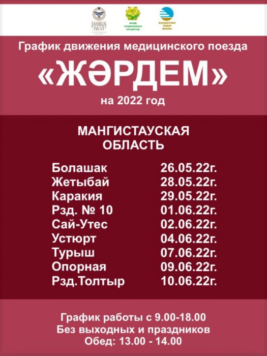 - В 2022 году медицинские поезда проедут по всему Казахстану, охватив при этом 147 станций отдаленных районов 14 областей страны. Первая остановка – станция Болашак в Мангистауской области. – сообщили организаторы.