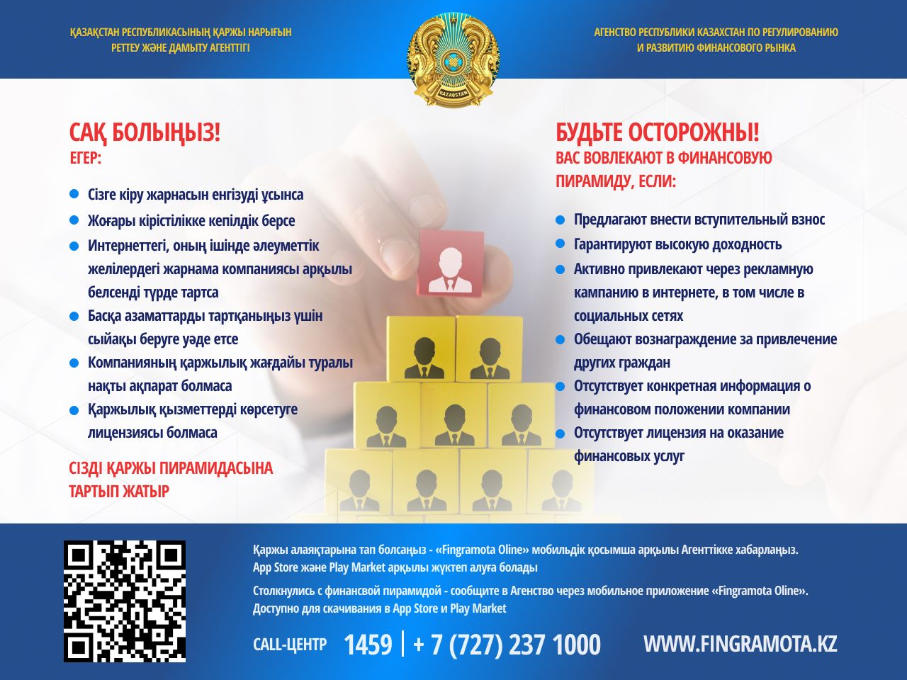 Агенство Республики Казахстан по регулированию и развитию финансового рынка дает рекомендации, как понять, что вас вовлекают в финансовую пирамиду.