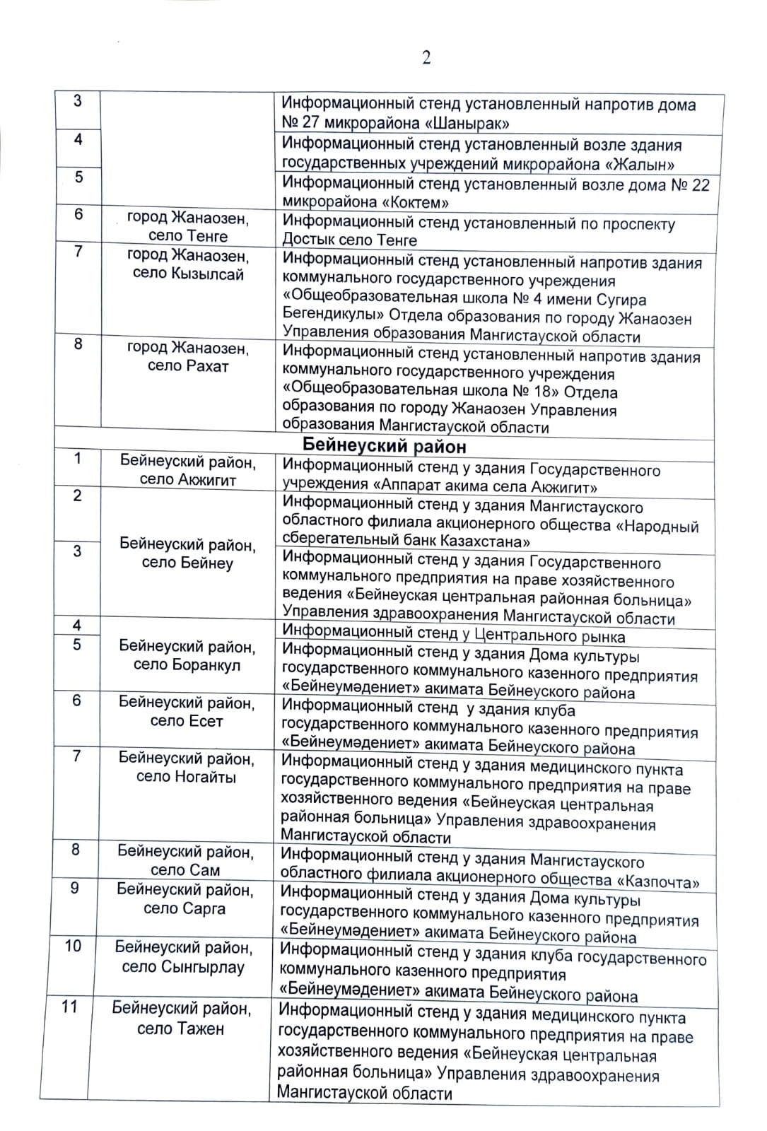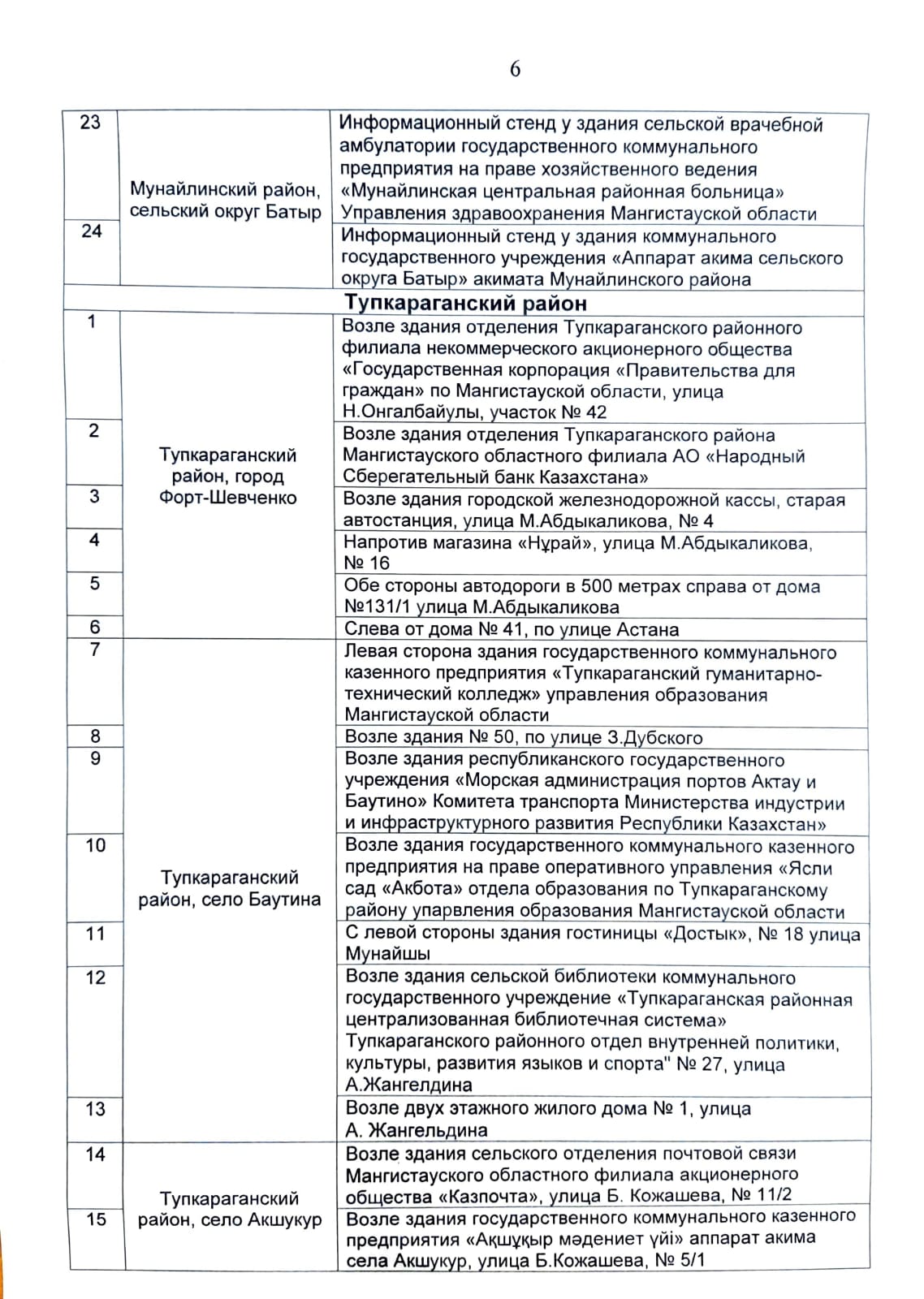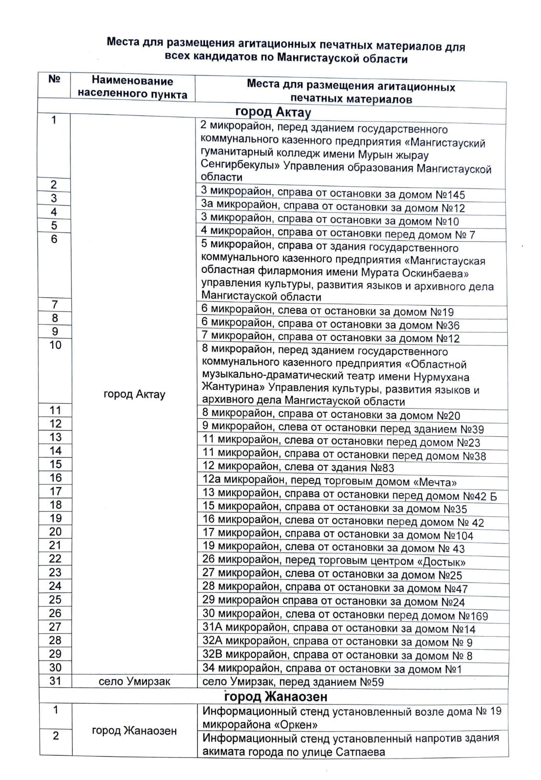 Перечень мест для размещения агитационных печатных материалов кандидатов в депутаты Мажилиса Парламента Республики Казахстан и маслихатов области, городов и районов по Мангистауской области.