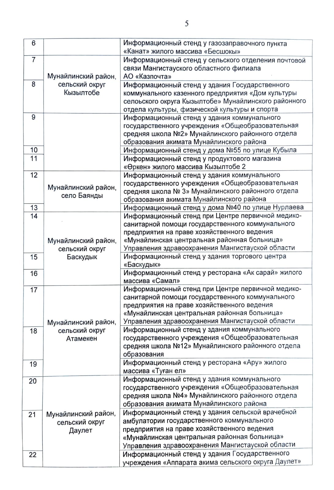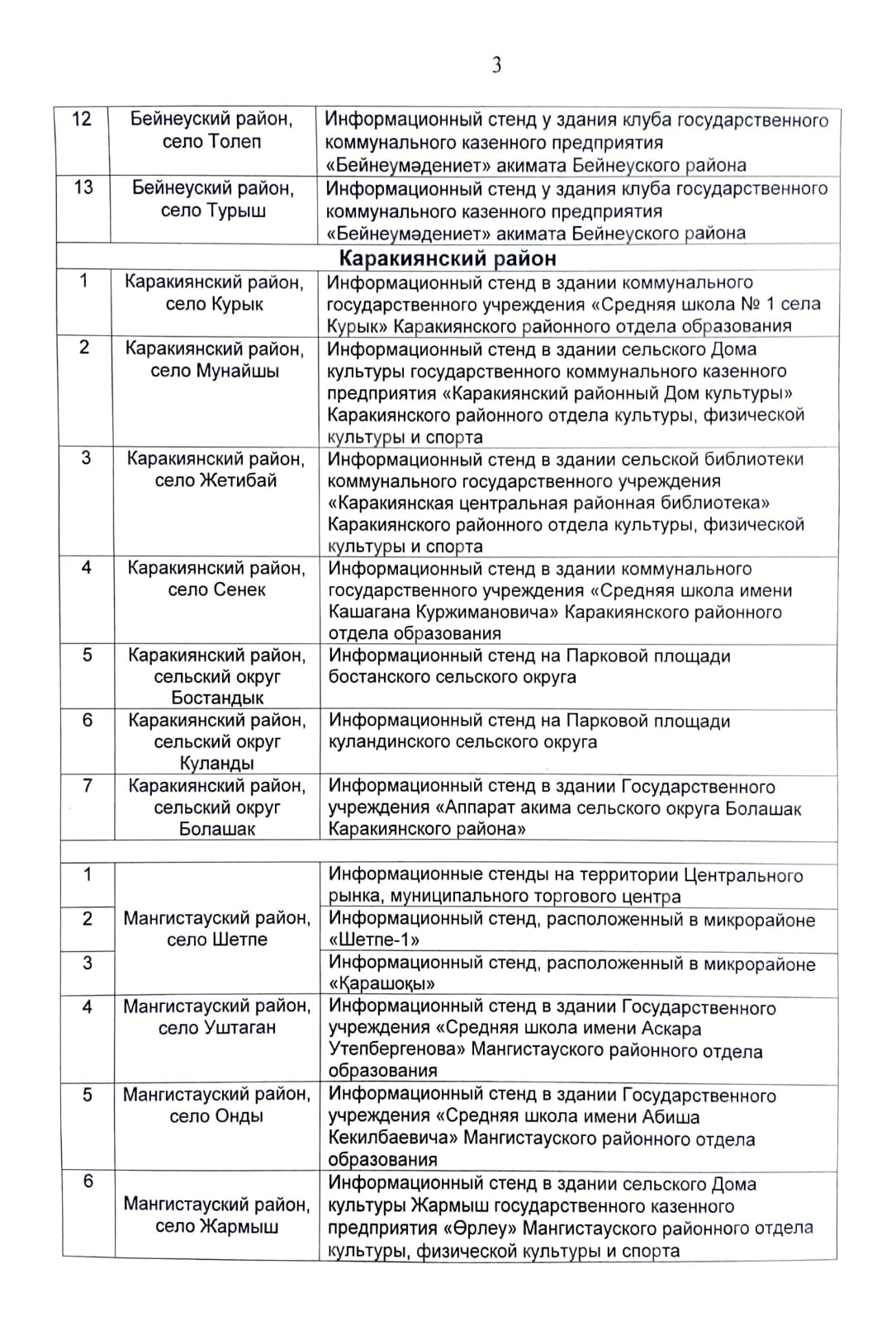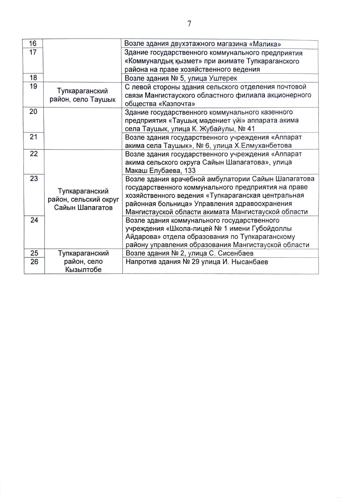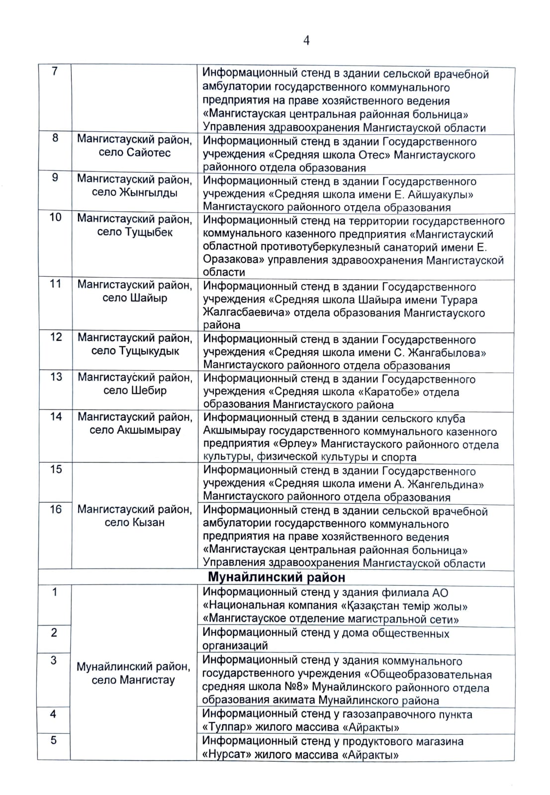 Перечень мест для размещения агитационных печатных материалов кандидатов в депутаты Мажилиса Парламента Республики Казахстан и маслихатов области, городов и районов по Мангистауской области.