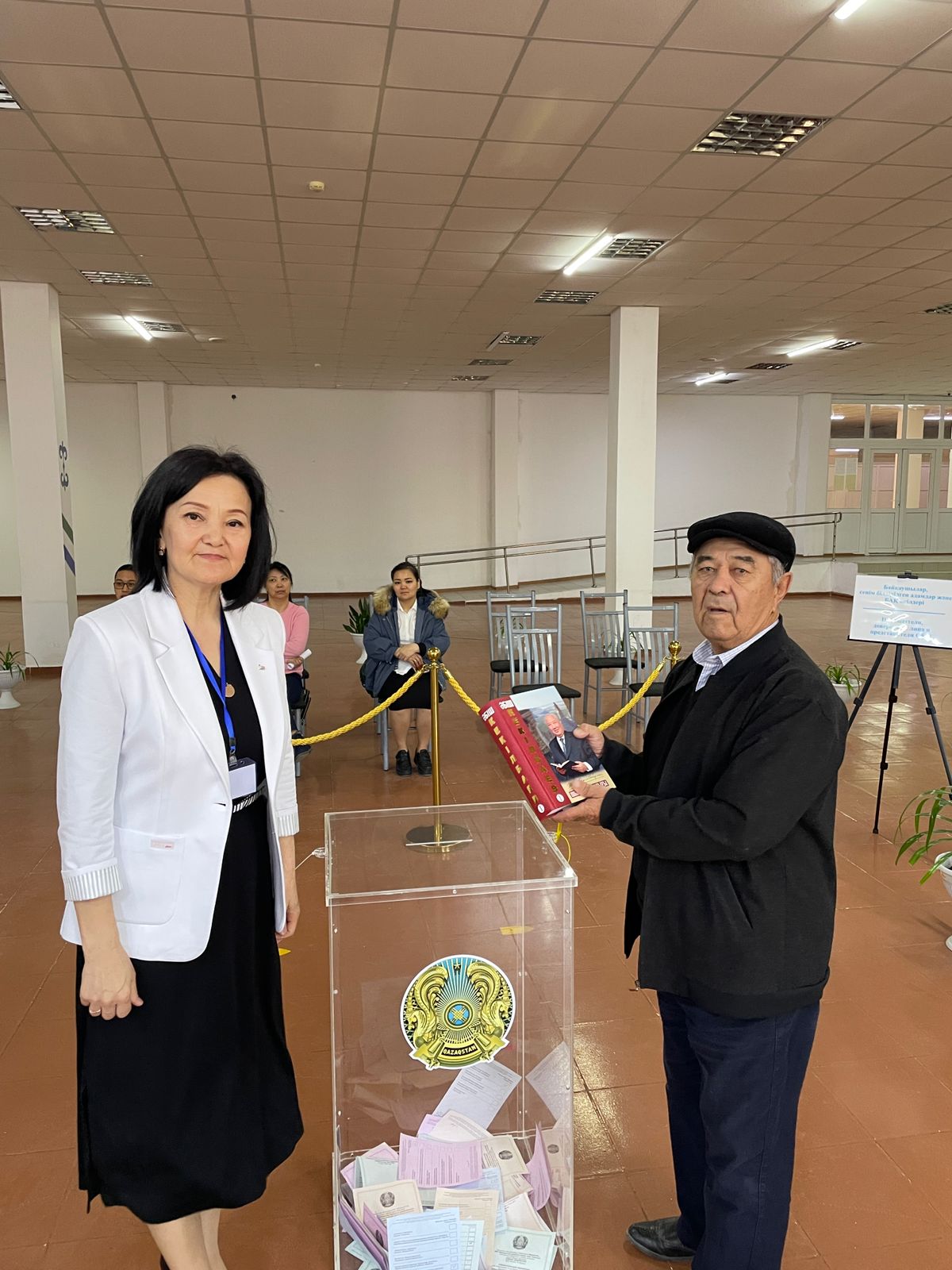 От имени избирательного участка почетному гражданину вручили книгу Абиша Кекилбаева.