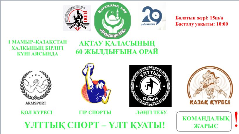 Вашему вниманию в преддверии 1 Мая - Дня единства народа Казахстана и 60-летия города Актау - общественный фонд «Фердаус НК» совместно с молодежью города Актау планируют провести командные соревнования по казахским национальным играм.