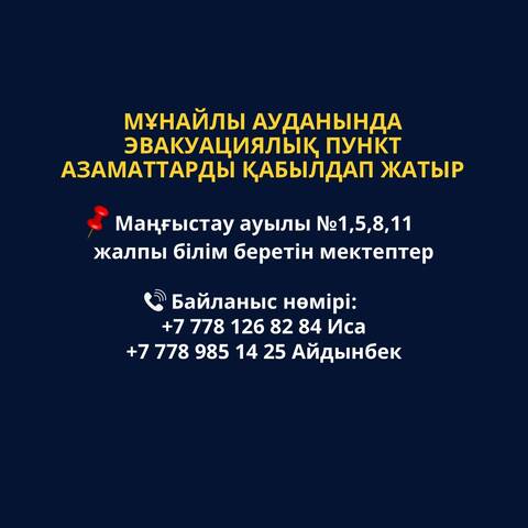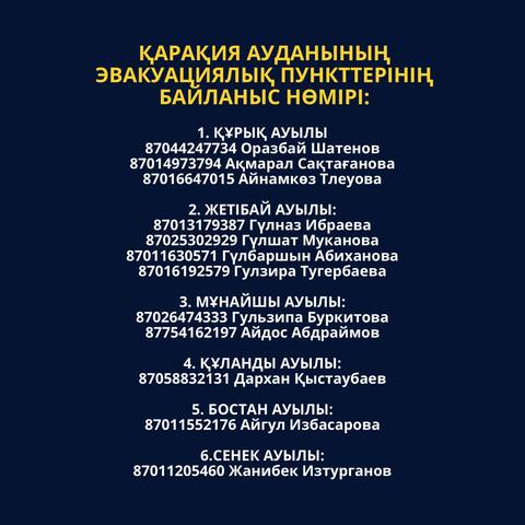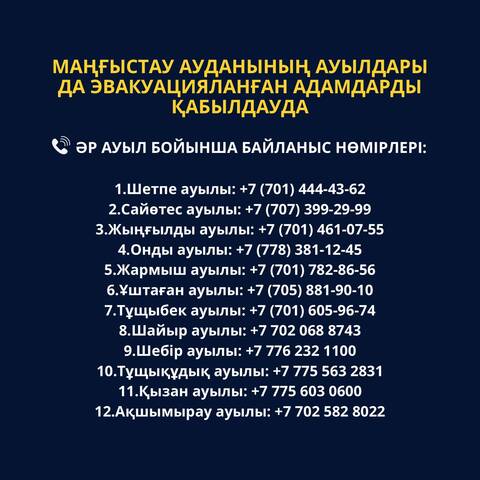 По Каракиянскому району также готовы принять эвакуированных граждан:1. село Курык: 87044247734, Оразбай Шатенов; 87014973794, Акмарал Сактаганова; 87016647015, Айнамкоз Тлеуова;