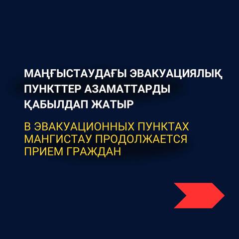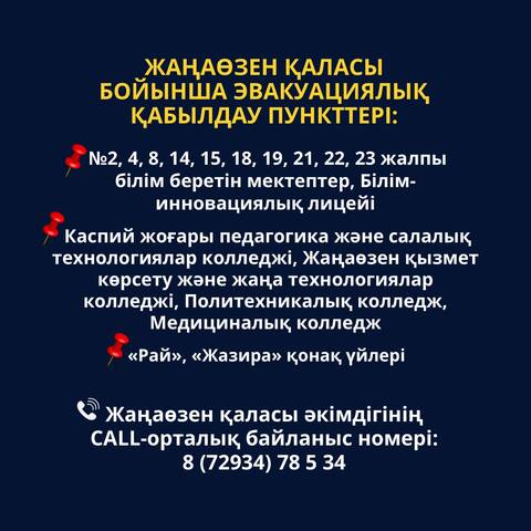 Пункты эвакуационного приема по городу Жанаозен:- общеобразовательные школы №№ 2, 4, 8, 14, 15, 18, 19, 21, 22, 23, лицей "Білім-инновация", Каспийский колледж высшей педагогики и отраслевых технологий, Жанаозенский колледж сервиса и новых технологий, политехнический колледж, медицинский колледж.