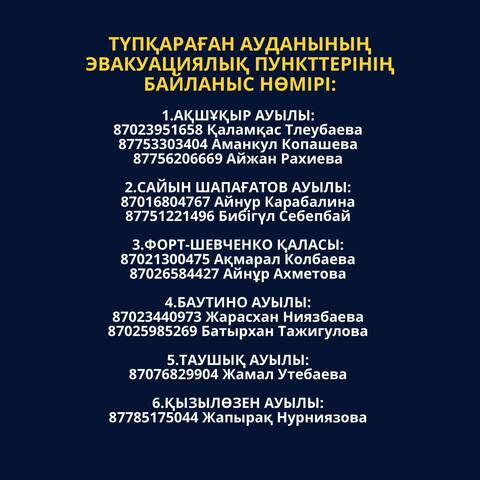 Контактный номер эвакуационных пунктов Тупкараганского района:1. село Акшукур: 87023951658, Каламкас Тлеубаева; 87753303404, Аманкул Копашева; 87756206669, Айжан Рахиева;