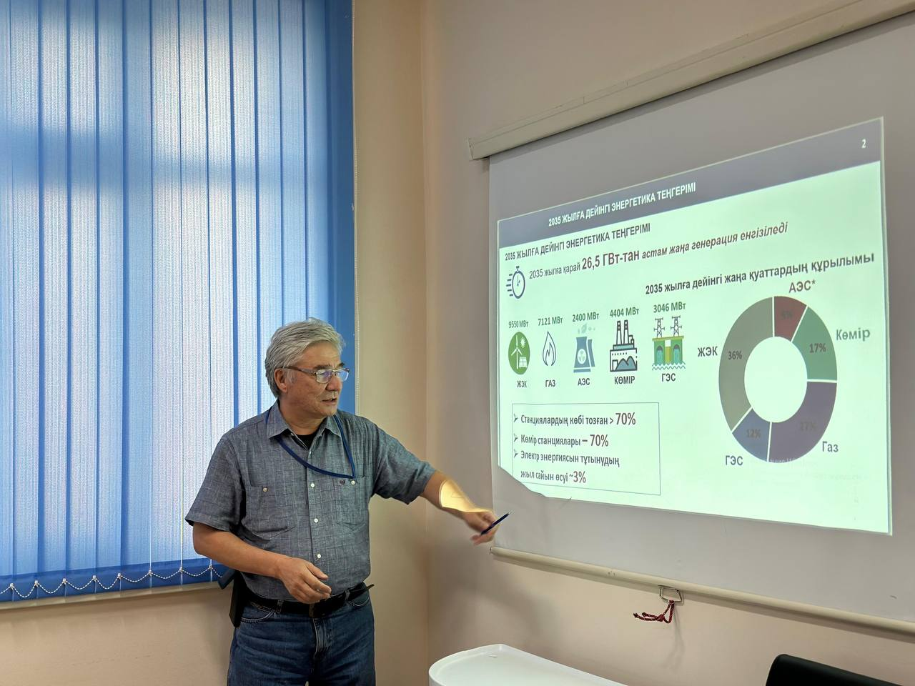 Руководитель  подразделения реакторной установки БН-350 ТОО "МАЭК" Марат Молдагулов разъяснил развитие атомной отрасли в Казахстане. Проведен сравнительный анализ структуры мощностей до 2035 года в случае строительства АЭС, электроэнергии, передаваемой через ВИЭ и АЭС.