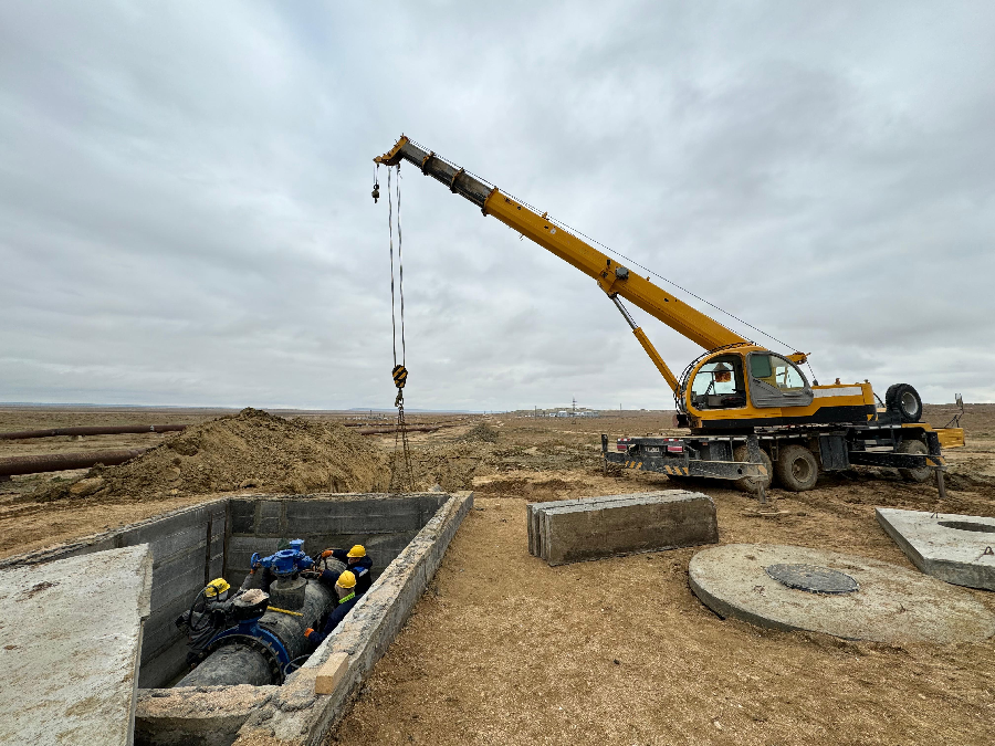 Ведется строительсво водопровода протяженностью 47 километров, диаметром 900 мм - от месторождения Куйылыс до опреснительного завода «Каспий». Работы ведутся интенсивно. После завершения работ на данном участке будем запускать воду для заполнение труб, - сообщил руководитель отдела управления энергетики и жилищно-коммунального хозяйства Мангистауской области Анвар Туляков.