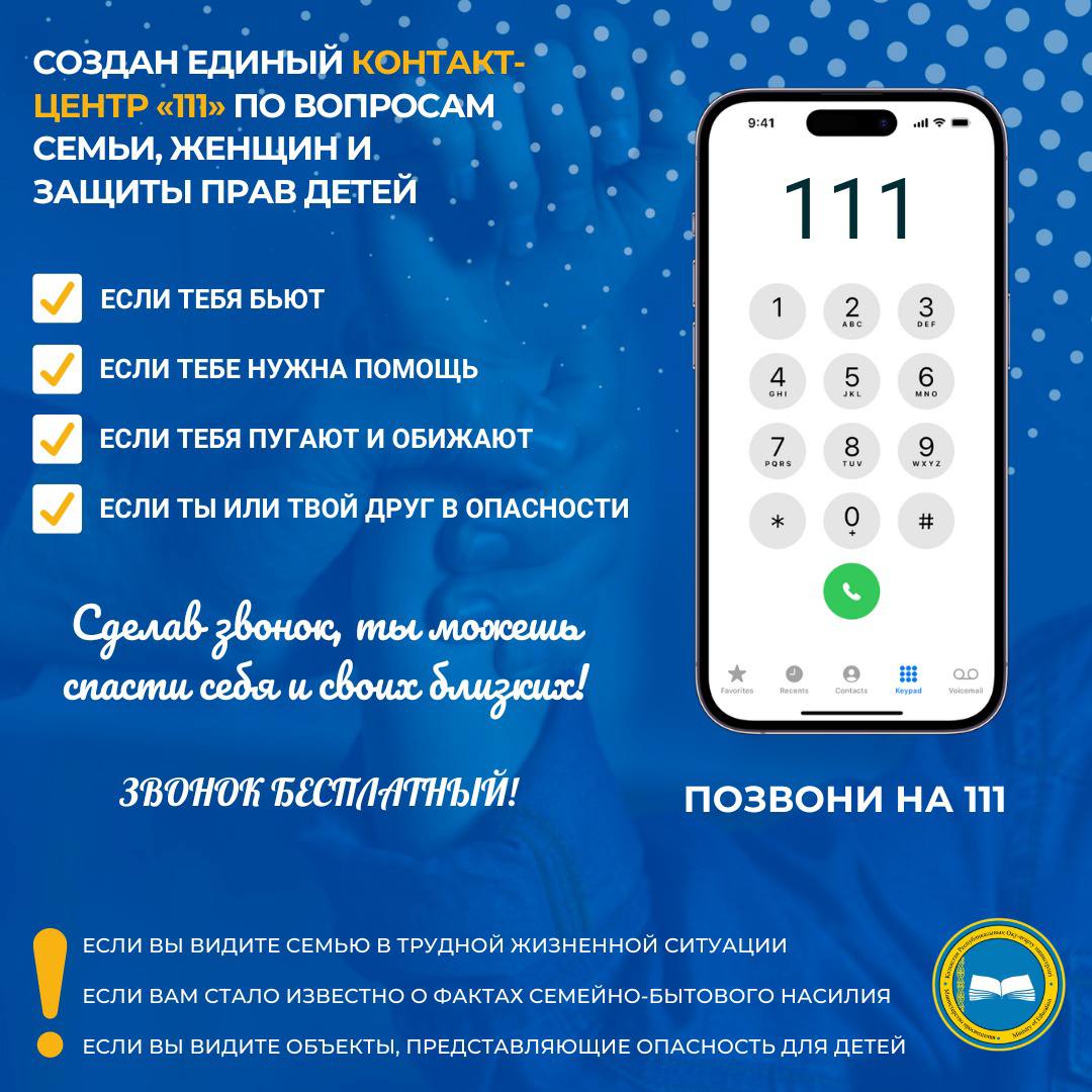 В Казахстане создан единый контакт-центр «111» по вопросам семьи, женщин и защиты прав детей. Звонок бесплатный.