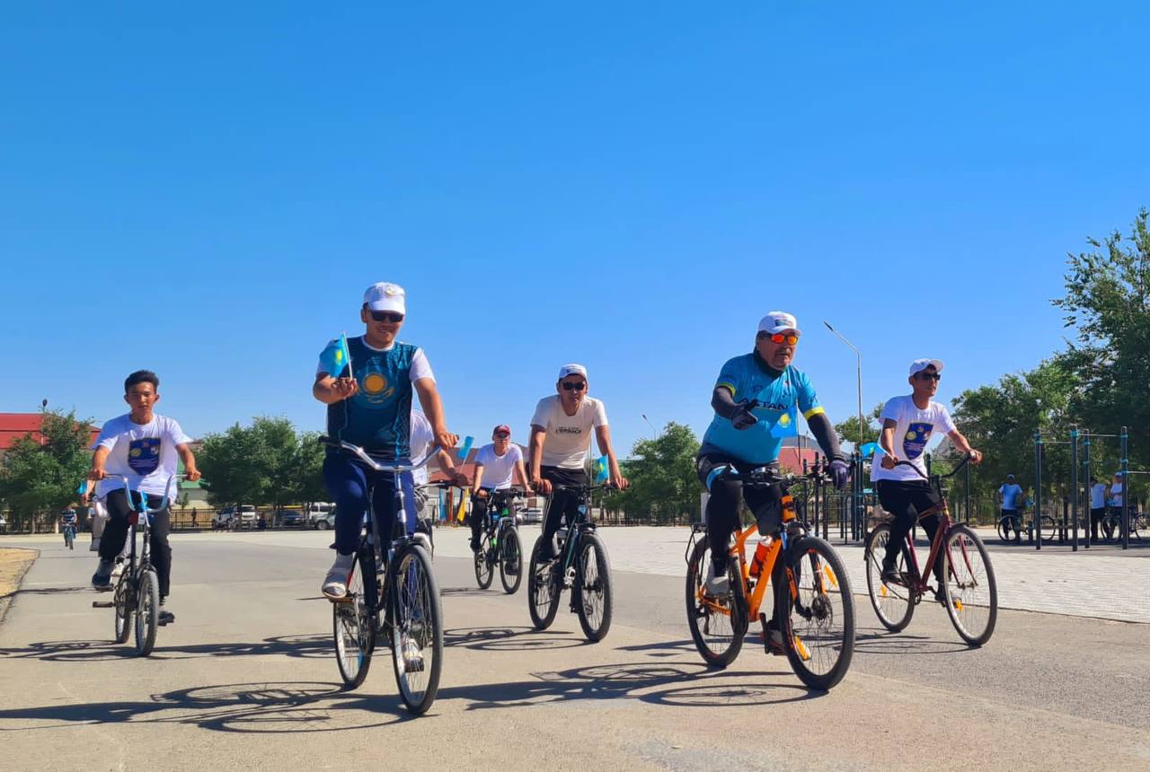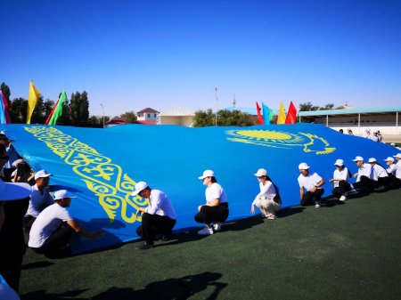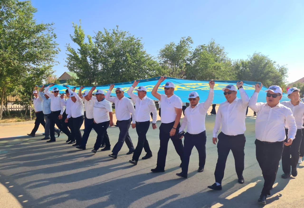 По информации пресс-службы акимата Бейнеуского района, в 09:00 часов сотрудники акимата и местная молодёжь, стартуя с районного Дома культуры, дошли до центрального стадиона, держа в руках огромный флаг, его высота составляет 15 метров.