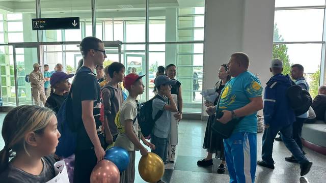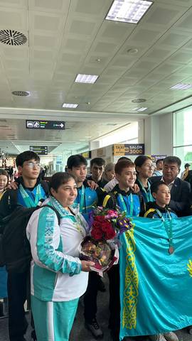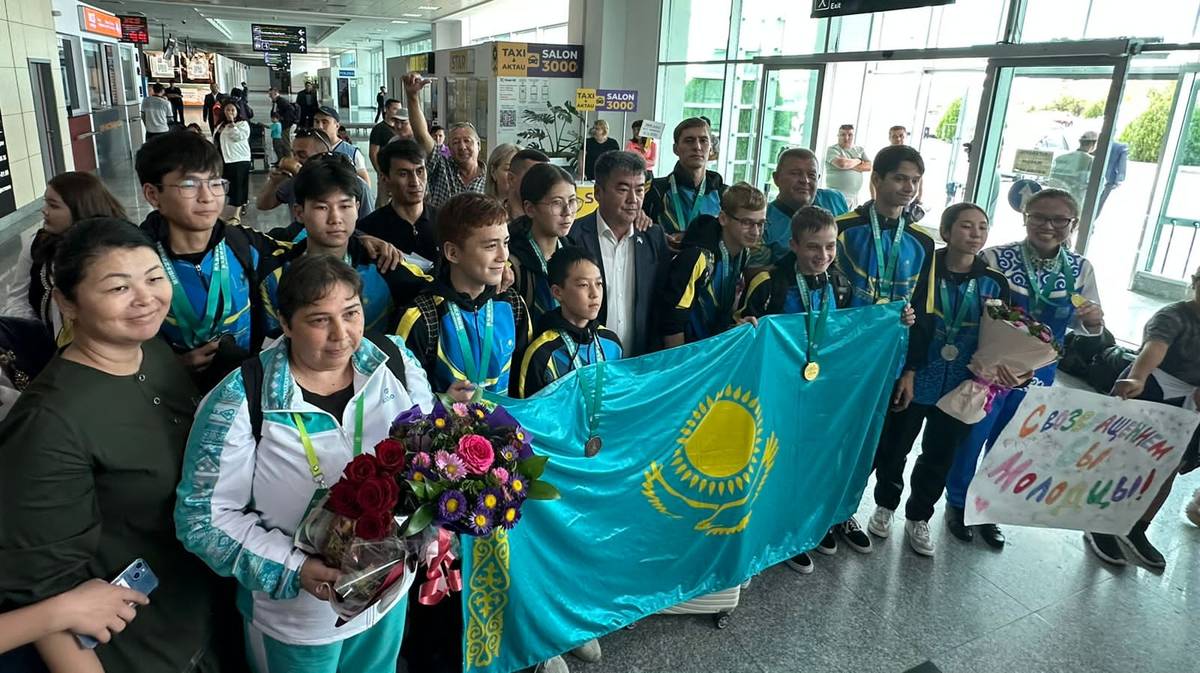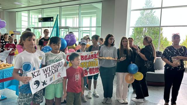 Встречающие скандировали имена чемпионов, а также растянули плакаты с поздравлениями. Для участников крупного спортивного чемпионата накрыли стол прямо в аэропорту, их угощали казахскими национальными блюдами.