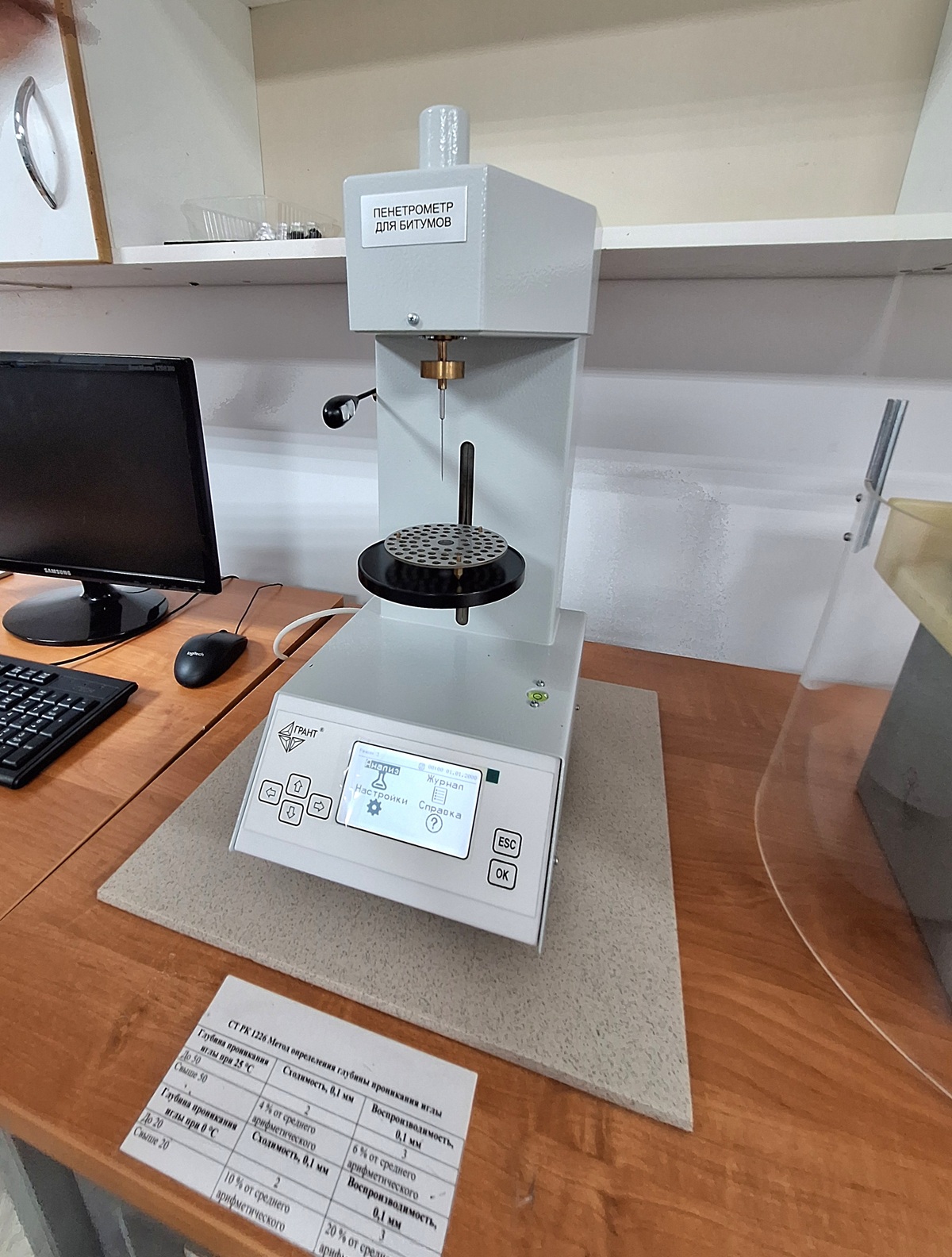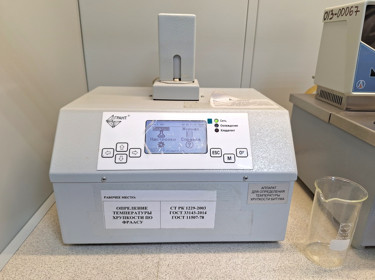 В лаборатории установлен прибор для определения температуры хрупкости по Фраасу. Такая мера важна для определения последствий эксплуатации дорог из данного материала при низких температурных условиях Казахстана.