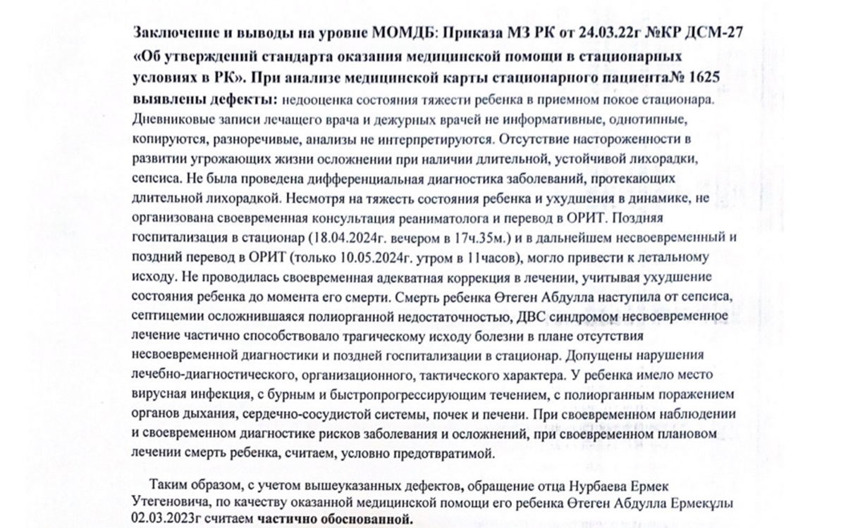 По словам отца ребенка, они не оставили это дело и написали заявление в администрацию президента РК, Министерство здравоохранения РК и Генеральную прокуратуру РК с просьбой рассмотреть данное дело.