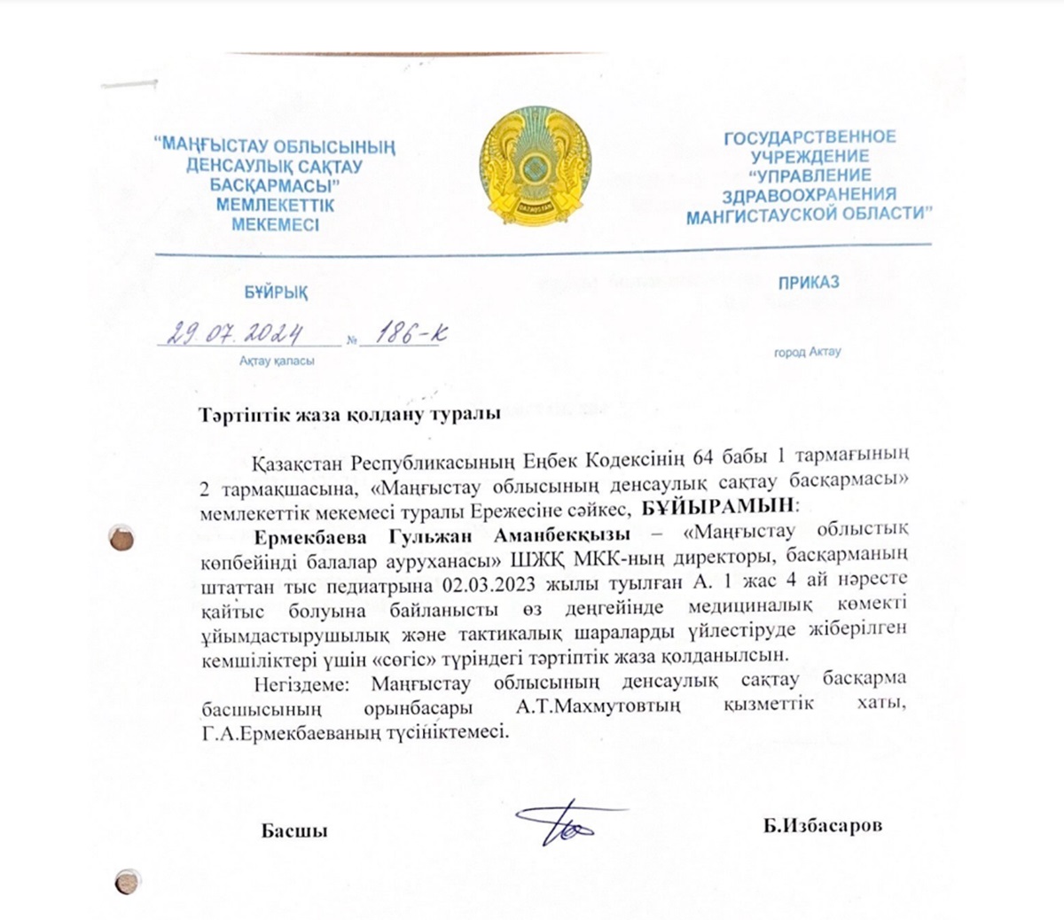 Приказ о применении дисциплинарного взыскания в отношении руководителя областной многопрофильной детской больницы.