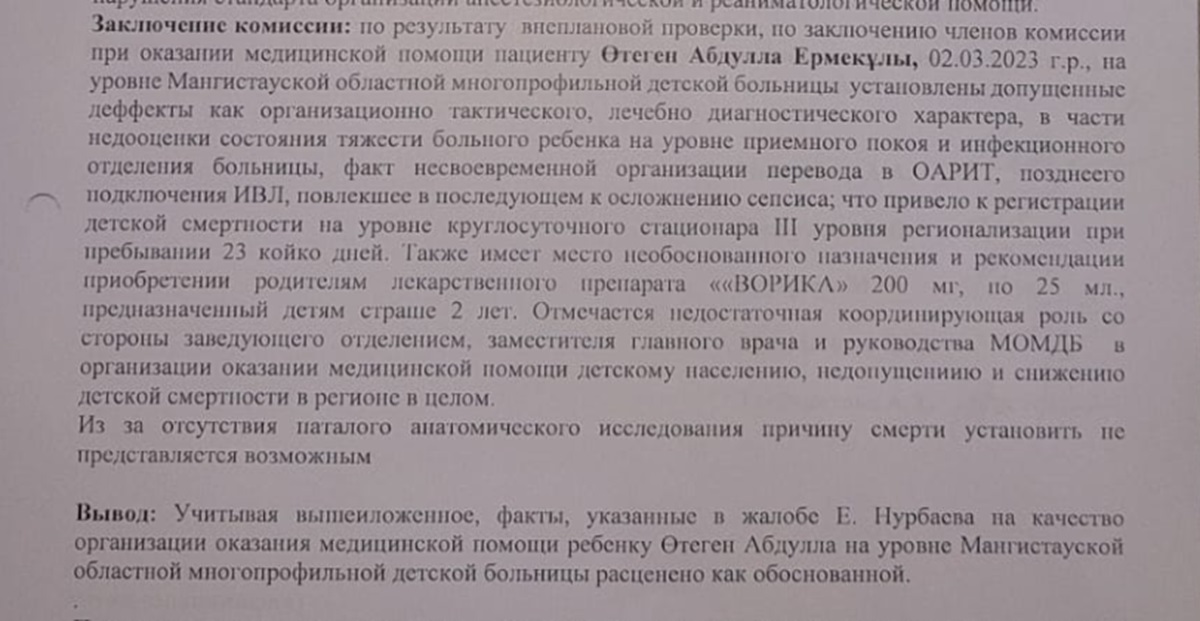 Ермек Нурбаев сообщил, что по факту смерти ребенка управление здравоохранения Мангистауской области провело проверку.