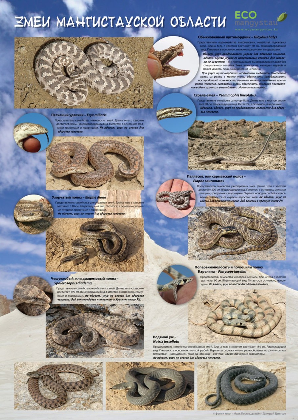 Марк Пестов рассказал, что несколько лет назад совместно с руководителем НПУ «Эко Мангистау» Кириллом Осиным они подготовили макет информационного плаката «Змеи Мангистауской области», на котором представлены все восемь видов змей, обитающих в регионе. На плакате также размещена краткая информация о каждом виде.