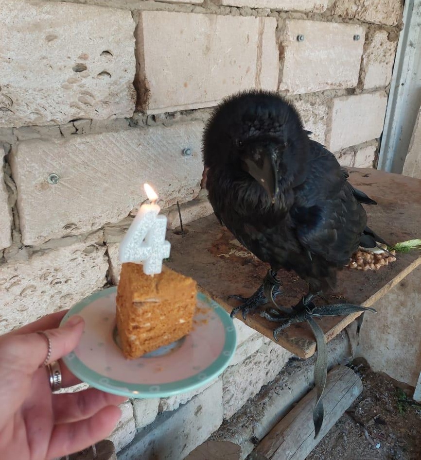 Ворон оказался невероятно сообразительным. Щеколду на вольере открыл сам – пришлось повесить навесной замок. Узнаёт свою чашку, защищает игрушки, «доносит» на кошек, если те запрыгивают на стол. Хозяева слышат характерный шум – значит, на кухне что-то происходит.
