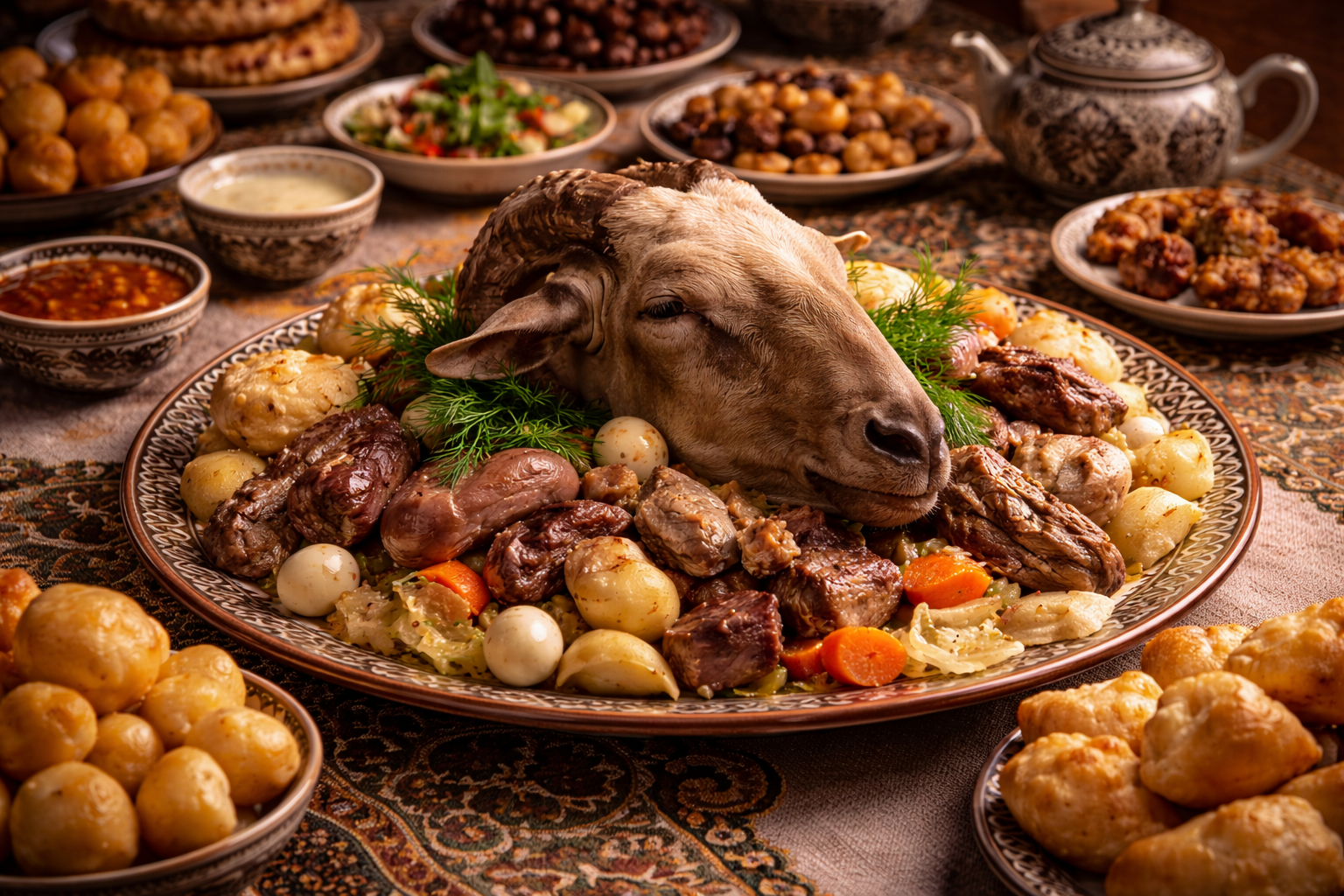 Так появился обычай, по которому на торжествах голову барана преподносят самому почётному аксакалу. Именно он распределяет её части между гостями: уши дают молодёжи – чтобы они слушали старших, язык – женщинам, чтобы они говорили добрые слова, глаза – взрослым женщинам, чтобы они были внимательными и мудрыми. Всё это сопровождается шутками и добрыми пожеланиями, создавая атмосферу праздника.