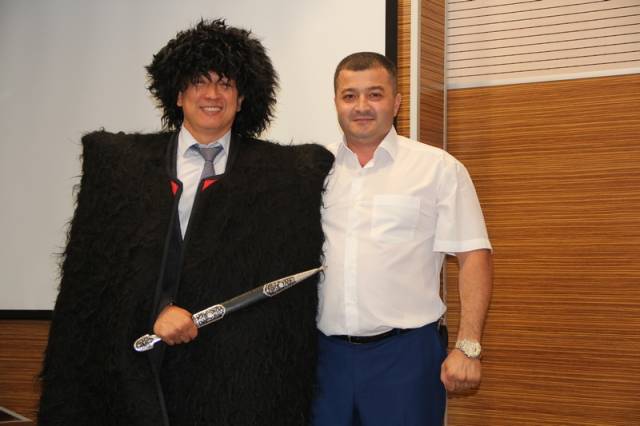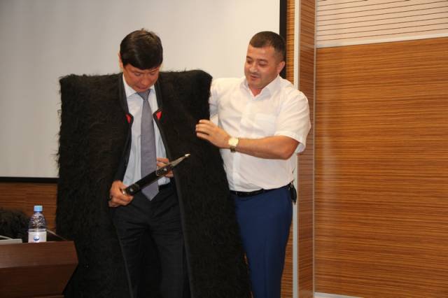 Судья международной категории AIBA Руслан Бибуев вручил почетную грамоту и подарки президенту федерации бокса Мангистауской области Марату Орманову от имени президента федерации бокса Чеченской республики Эдилова В.Х.