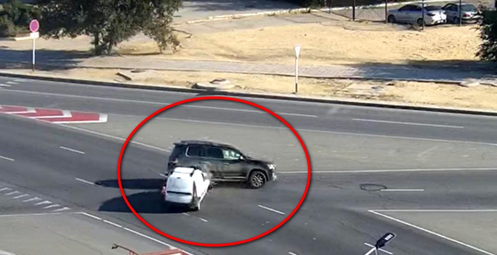 По кадрам видно, как Lada Largus движется по центральной дороге в сторону площади «Ынтымак». В это время со стороны 14 микрорайона ехал Lexus LX 570. Водитель последнего не уступил дорогу Lada Largus, и столкновения избежать не удалось. От удара вбок внедорожник опрокинулся.