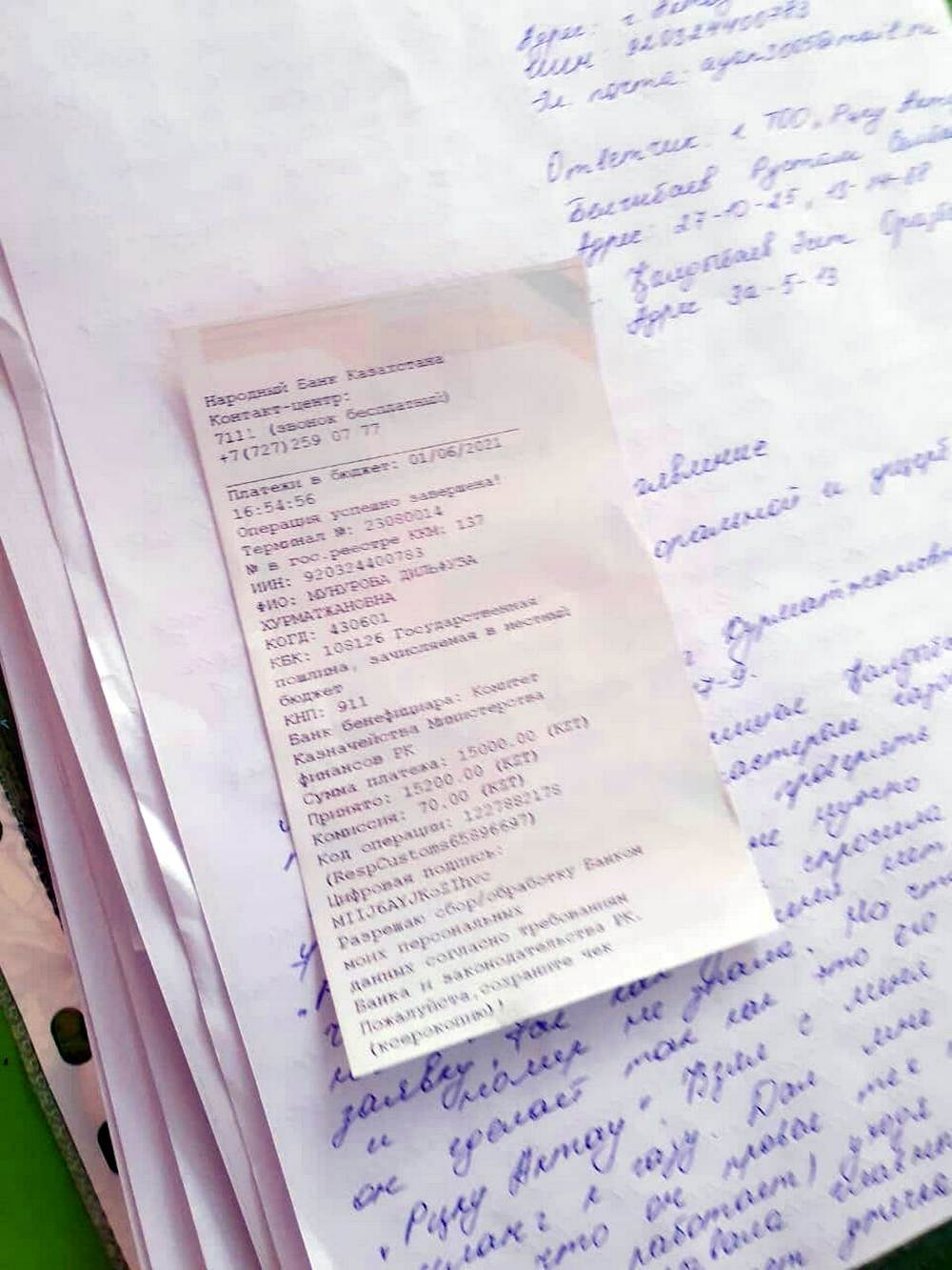 - Он предоставил мне две бумаги. Как оказалось, там написано, что он провёл техническую проверку, и всё работает исправно. Уходя, он сказал, чтобы я постоянно закрывала главный газовый кран после готовки и в случае утечки сразу позвонила ему. Он также заходил и к моим соседям, которые отправляли деньги ему за услугу на Kaspi Gold, - говорит Дильфуза.