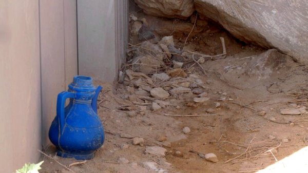 Рядом с туалетом стоит пустой кувшин.