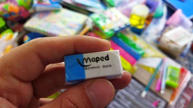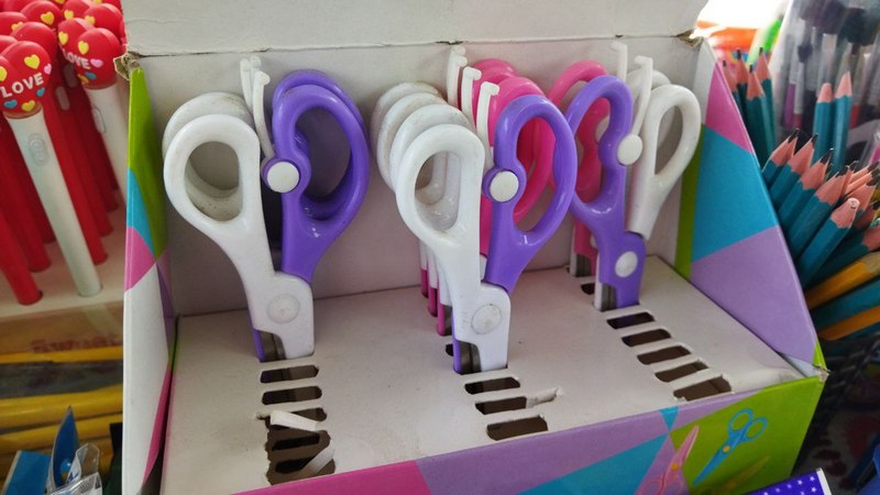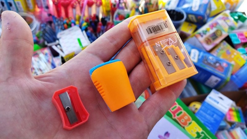 Точилки есть самые простые по 50 тенге, 150 тенге, а также за 400 тенге - для карандашей разных диаметров (они продаются вместе с ластиком и зеркалом).